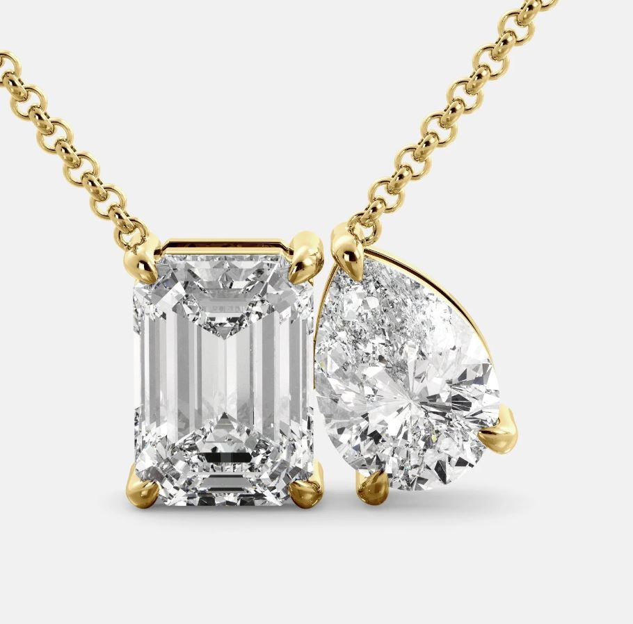 Toi Et Moi Diamond Necklace in a stunning 14K yellow gold finish is a luxurious and meaningful piece, perfect for expressing love and commitment. The necklace features two brilliant diamond pendants, each in a unique shape, beautifully representing the union of two souls. The design embodies the classic Toi Et Moi concept, which translates to "you and me" in French, symbolizing the deep connection between two individuals. One diamond is often cut in a round or pear shape, while the other may be an oval or heart shape, creating a striking contrast that enhances its visual appeal.