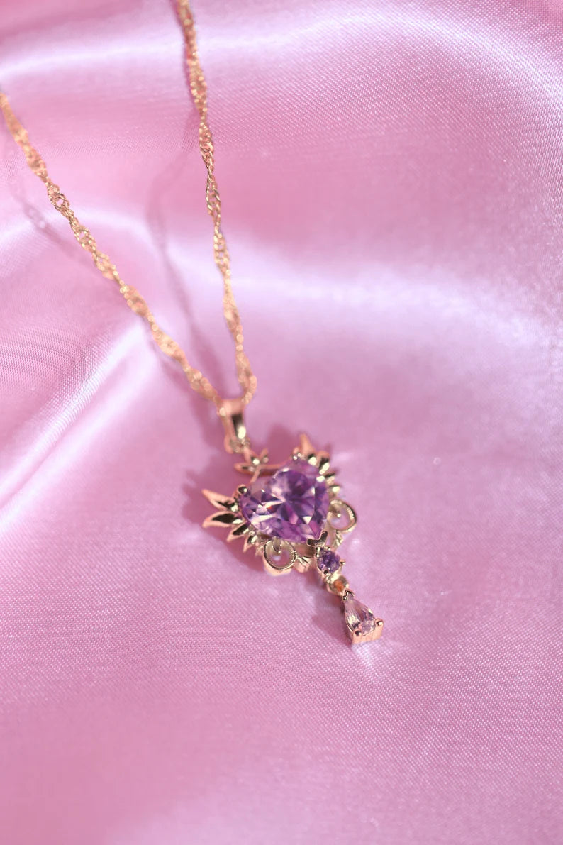 Enchanting Anime Inspired Necklace in 14k Yellow Gold Vermeil: Unique Purple Heart Pendant with Wing and Swinging Drop